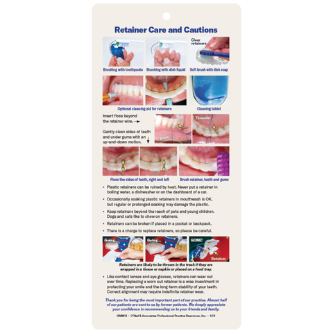 Description: Front: Photos of various retainer issues and a  list of precautions. Back: "Retainer Care and Cautions" with photos of home care techniques.